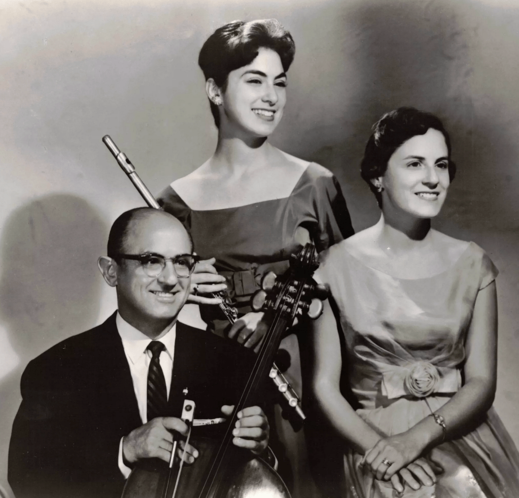 Louise started to play flute at a very young age and soon began to take lessons to become a professional musician. Studio flutist Sheridon Stokes, who was performing with Louise’s father in the Fox orchestra, was one of her teachers, as also were legendary flutists Haakon Bergh and Arthur Gleghorn. Louise formed a chamber music trio – the Di Tullio Trio – with his father Joe and her sister Virginia (an accomplished pianist). The trio performed extensively on the west coast of the US and was chosen to play the opening concert of the first Brand Library Concert Series in Glendale, where they all lived. “I grew up as a musician with the support, encouragement, and advice of my father, several uncles, and cousins–all busy, working professionals,” wrote Louise in 2009 in the booklet notes of her own solo album The Hollywood Flute.