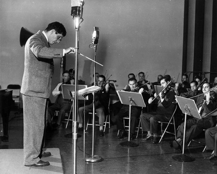 Bernard Herrmann (born in New York in 1911) was a totally different character and certainly a unique figure. Son of Jewish immigrants, he started developing a penchant for music since childhood. He won a composition prize at the early age of 13 and then studied music at the New York University under esteemed teachers as Percy Grainger and Philip James, and later at the Juilliard School of Music. Herrmann’s foremost interest was conducting and joined CBS Radio as a staff conductor, but soon he was appointed music director of the Columbia Workshop, an experimental radio drama series for which he composed and arranged music. He also became chief conductor of the CBS Symphony Orchestra, producing a series of radio programs featuring a great deal of contemporary music and introducing the audience to the then-unknown music of Charles Ives. Much like Steiner, Bernard Herrmann had one foot firmly set in the past (he was a great connoisseur of the classical repertoire and had an intimate knowledge of the works by many composers) and another aiming at the future. At CBS he became acquainted with the young burgeouning talent under the name of Orson Welles, with whom he started to collaborate on several radio productions, including the famous adaptation of H.G. Wells’ The War of the Worlds. Herrmann was very fond of the medium of radio, in which he found an ideal vehicle for experimentation like unusual instrument combination, and compositional technique based on short motifs and repeated patterns, all of which would become staples of his writing for the movies.