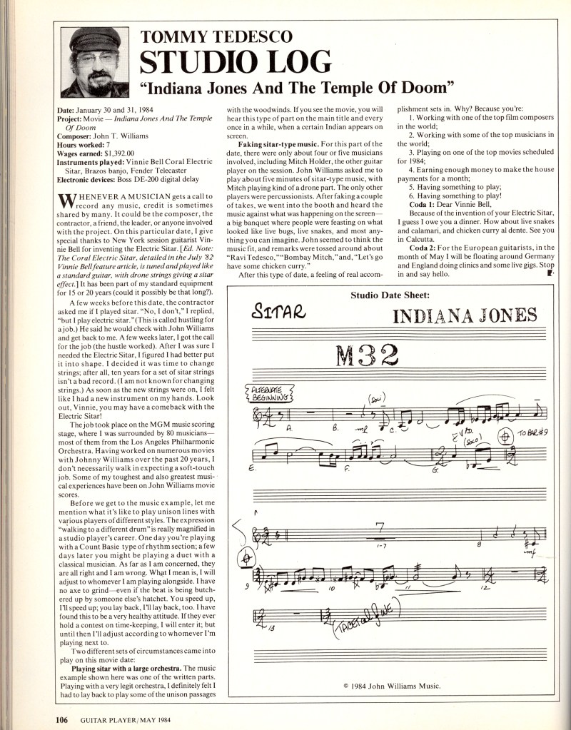 Williams employed Tommy Tedesco also for his skills as a multi-instrumentalist: He can be heard playing sitar on Indiana Jones and The Temple of Doom (1984), while on Indiana Jones and The Last Crusade (1989) he performed on cues featuring mandolin and bouzouki. Tedesco was a well-known “doubler” among studio musicians, often being asked to play more than one instrument especially on film sessions.