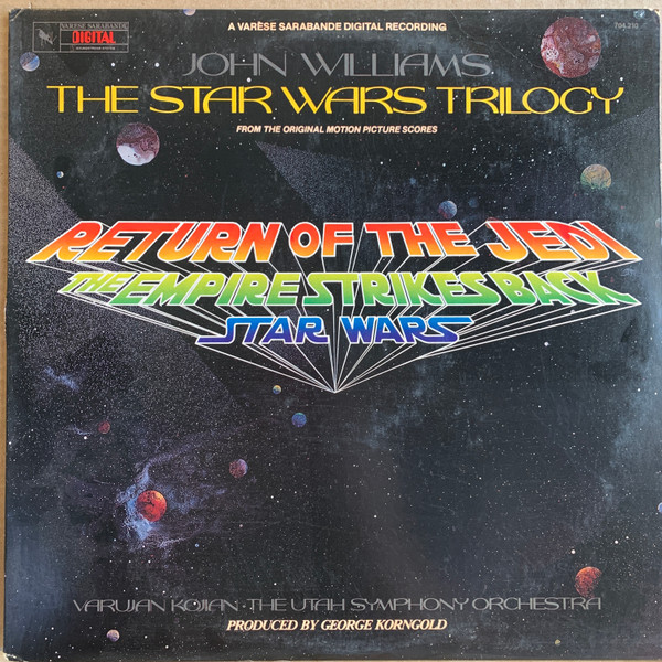 Produced again by George Korngold and sanctioned by the composer himself, John Williams: The Star Wars Trilogy (Varèse Sarabande – 704.210) had the distinct feature of being the very first time music from the all three films was featured together in a single album. Armenian-American conductor Varujan Kojian leads the Utah Symphony Orchestra in a collection of very fine readings of the warhorses from Williams’ galactic scores and features some lovely solo performances by Jeffrey Kirschon (French Horn) in “Princess Leia’s Theme” and “Luke And Leia,” while Gene Pokorny (future Principal Tuba of the Chicago Symphony) does a phenomenal interpretation of “Jabba The Hutt.” Kojian guides the orchestra at tight pace during the action setpieces (“Here They Come!,” “The Asteroid Field”), always displaying precision and getting a brilliant sound from the Utah Symphony. Again, Williams’ music sounds spectacular in a beautifully recorded album featuring crisp early digital sound courtesy of engineer Bruce Leek and the beautiful sonics of the renowned Orchestra Hall in Salt Lake City. As with Gerhardt’s Jedi album, this re-recording also features more music from the third film that was unexplicably excised from the official soundtrack album (the battle piece “Fight with TIE Figthers” and especially the pivotal “Darth Vader’s Death” scene), becoming another sought-after item from John Williams’ aficionados. Over the years, the album has been reissued multiple times on CD and, more recently, in a remastered vinyl “coloured” collector’s edition.